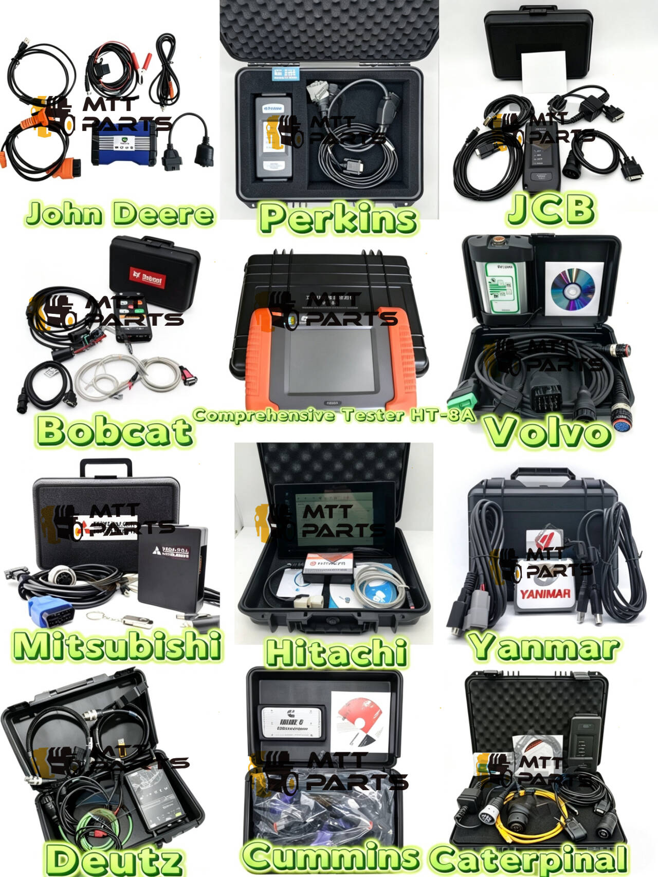 Silma torkab see, kui praktilised need välja näevad. Puuduvad üldised tööriistad, mis võivad pooleldi töötada; need on brändispetsiifilised seadistused, mis ühenduvad korralikult ja annavad teile tegelikult vajalikud andmed. Keskel on isegi kõikehõlmav kõik-ühes tester (HT-8A) ja valikud kaubamärkidele, mille jaoks on natuke raskem head diagnostikat leida, nagu Yanmar või Bobcat.